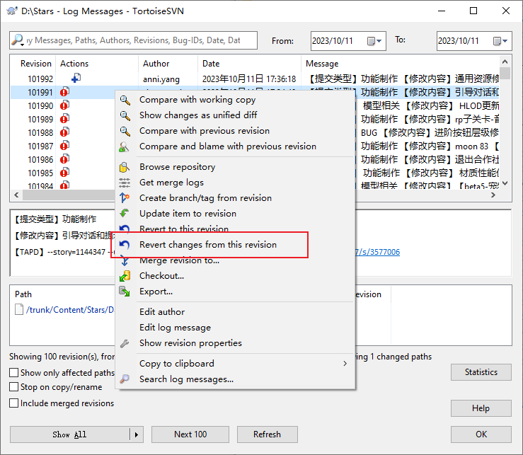 在项目根目录上右键选择TortoiseSVN->Show log,打开日志窗口。