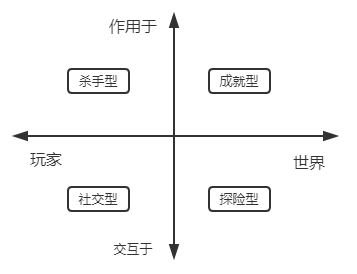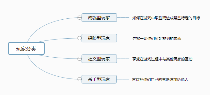 理查德·巴特尔 将MUD( Multi-User Dimension)玩家分为四个基本类型: 成就型玩家 、 探险型玩家 、 社交型玩家 、 杀手型玩家 。